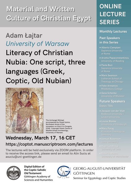 On March 17, at 4 p.m. CET, our colleague, Adam Łajtar (University of Warsaw), will give a paper titled "Literacy of Christian Nubia: One Script, Three Languages (Greek, Coptic, Old Nubian)."