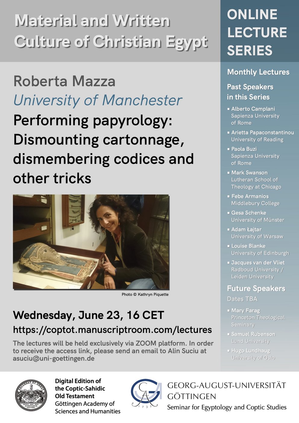 The next online lecture in our series Material and Written Culture of Christian Egypt will take place on June, 23 at 4 p.m. CET. Roberta Mazza (University of Manchester) will present her paper