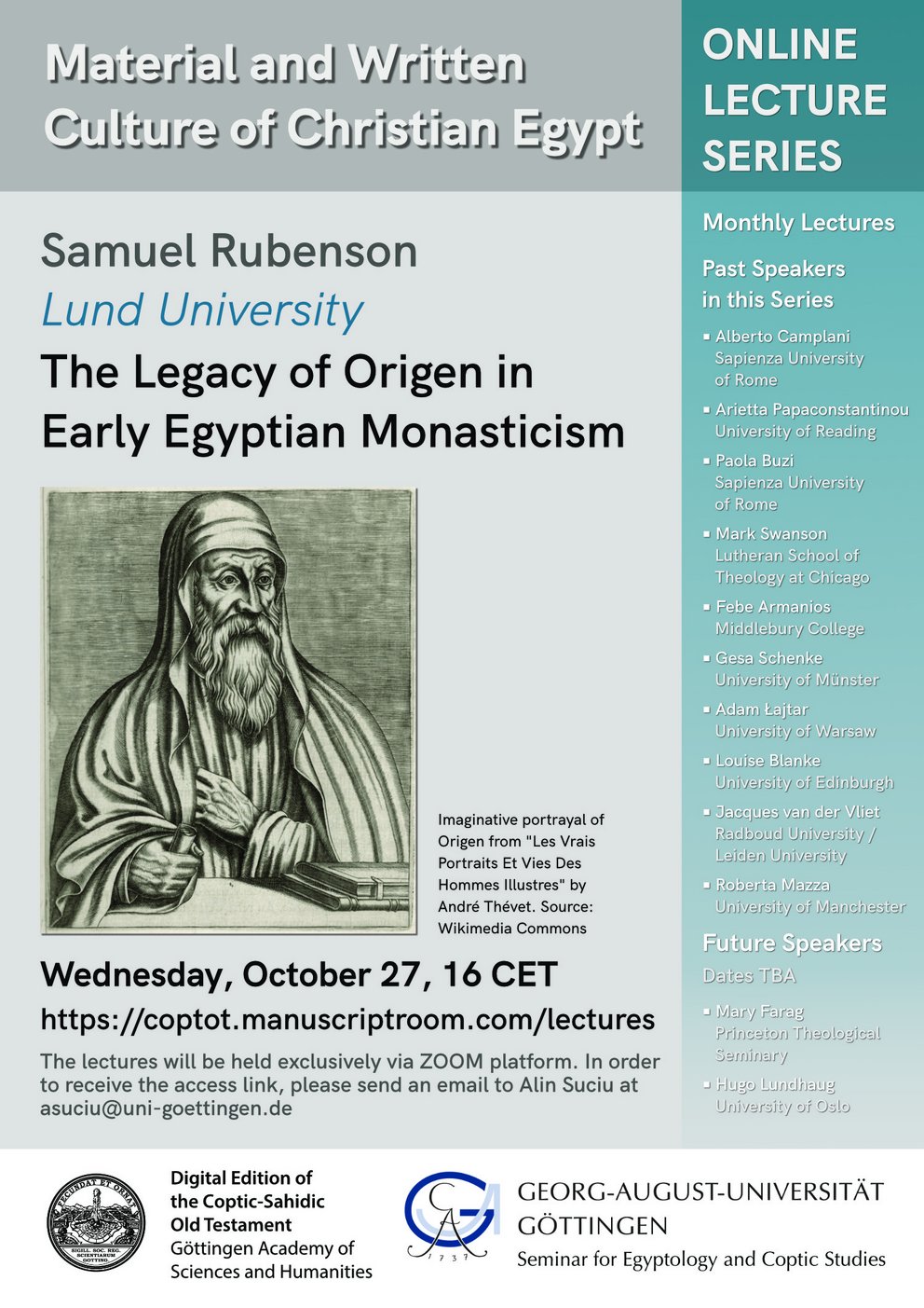 Samuel Rubenson (Lund University) will give a paper entitled "The Legacy of Origen in Early Egyptian Monasticism"