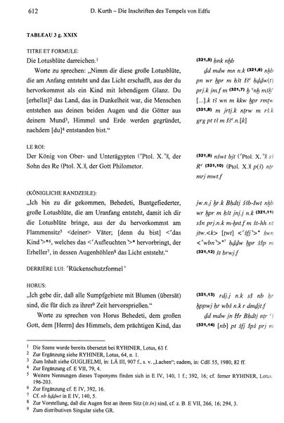 The translation of this text is published in ‚Inschriften des Tempels von Edfu I/2' on page 612. It is a ritual scene, where the king offers the god a lotus blossom: