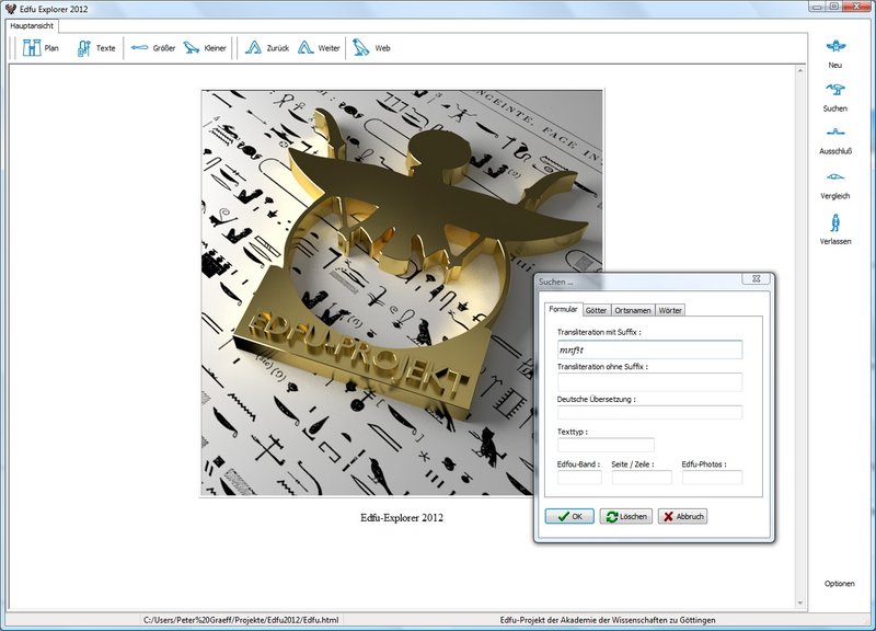 The so-called Edfu-Explorer (is not available anymore, see online version) is capable not only to show the relevant records (transliteration and translation) of a given search inquiry but also photographic material, the Chassinat version, internal collations and secondary literature.