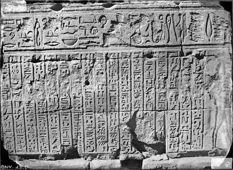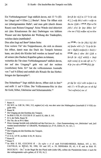 Elsewhere the temple is described in all it's details and dimensions. The ancient authors went from the inside out through the temple and described the individual building components, together with their names and use. In many cases they even gave reasons for the specific data. We owe our knowledge about the temple's rooms these texts. The following example can be found in ‚Inschriften des Tempels von Edfu I/2' on page 24: