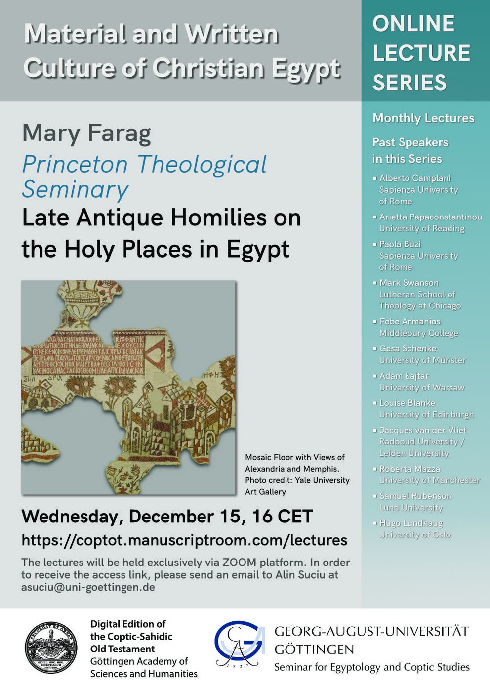 Das Göttinger Akademievorhaben "Digitale Gesamtedition und Übersetzung des koptisch-sahidischen Alten Testaments" und das Seminar für Ägyptologie und Koptologie der Universität Göttingen veranstalten im Wintersemester 2021/2022 gemeinsam die virtuelle Vortragsreihe „Material and Written Culture of Christian Egypt“. Die Vorträge werden monatlich stattfinden und in englischer Sprache gehalten. Ausgewiesene Experten sprechen zur Geschichte, Archäologie, Kultur und Literatur der christlichen Gemeinschaften in Ägypten vom 2. Jh. n. Chr. bis zur frühen Neuzeit. Mehr