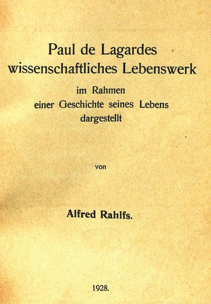 A. Rahlfs, Paul de Lagardes wissenschaftliches Lebenswerk im Rahmen einer Geschichte seines Lebens dargestellt, Berlin 1928.